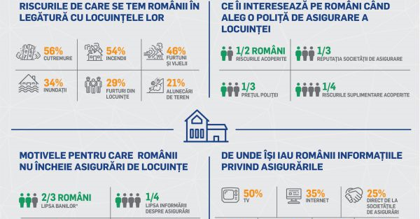 56% dintre romani se tem de cutremure, iar 54%, de incendii, potrivit unui studiu realizat de Uniunea Nationala a Societatilor de Asigurare din Romania (UNSAR). Conform aceluiasi studiu, romanii se mai tem de furtuni si vijelii (46%), inundatii (34%), alunecari de teren (21%), si de furtul bunurilor din locuinta. De asemenea, nici raspunderea civila fata de vecini nu este neglijata (19%). Acestea sunt concluziile unui studiu complex asupra perceptiei si preferintelor consumatorilor privind asigurarile obligatorii si facultative de locuinte realizat pentru UNSAR de catre IRES.